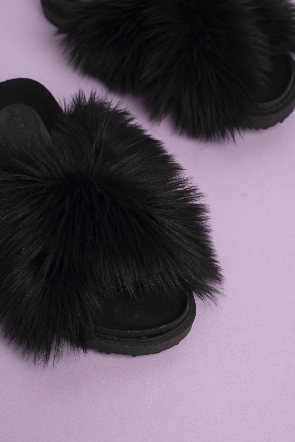 Tuflas de dos tiras cruzadas de piel sintética de pelo semi largo color negro, fino y opaco. Forro de terciopelo. Plantilla ergonómica forrada en microfibra, encastrada en base de EPS. Altura total de la base: 3 cm.
