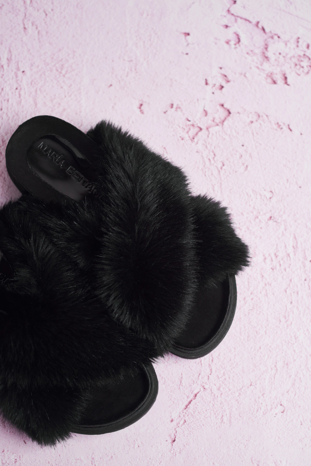 Tuflas de dos tiras cruzadas de piel sintética de pelo corto color negro. Forro de terciopelo. Plantilla ergonómica forrada en microfibra, encastrada en base de EPS. Altura total de la base: 3 cm.