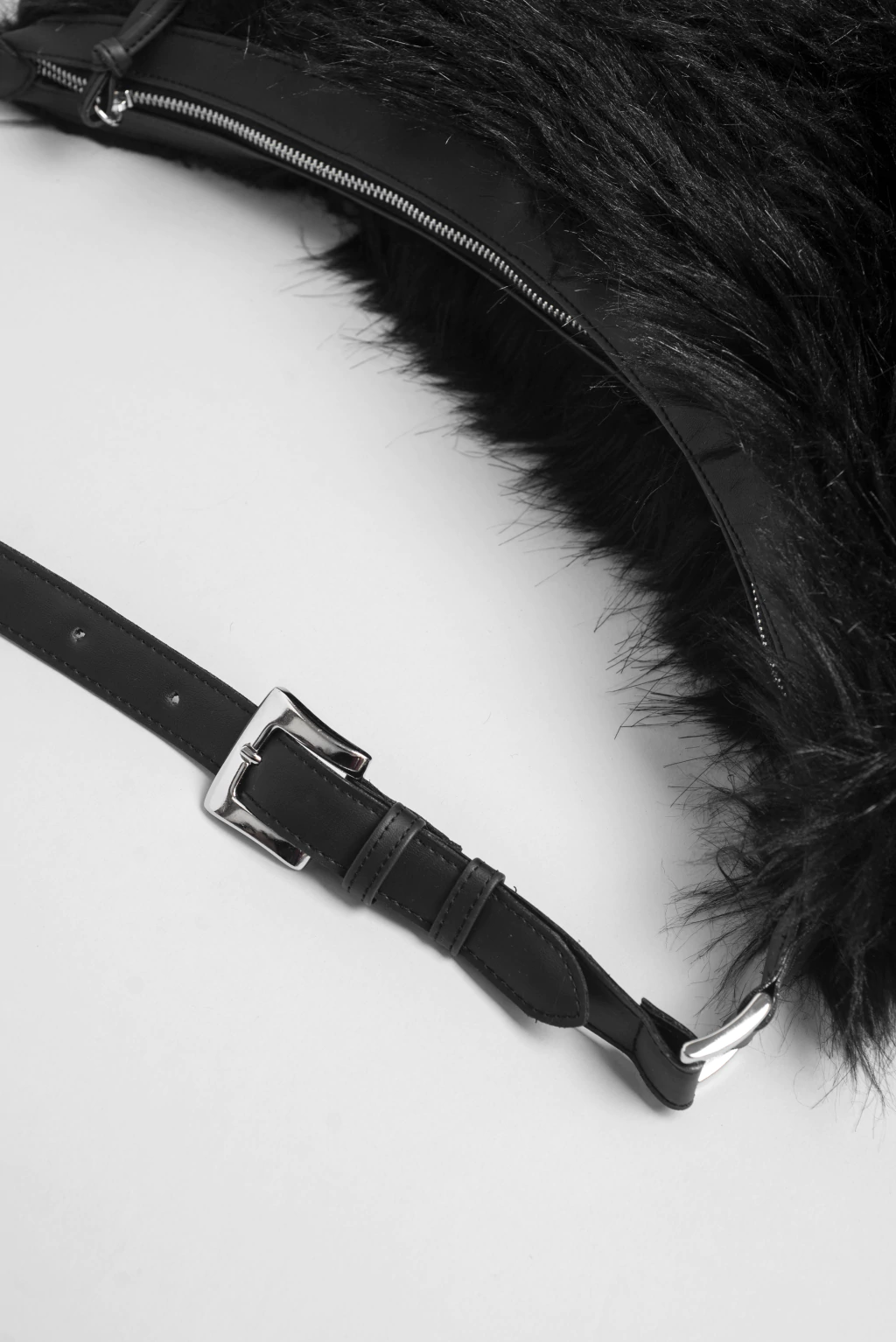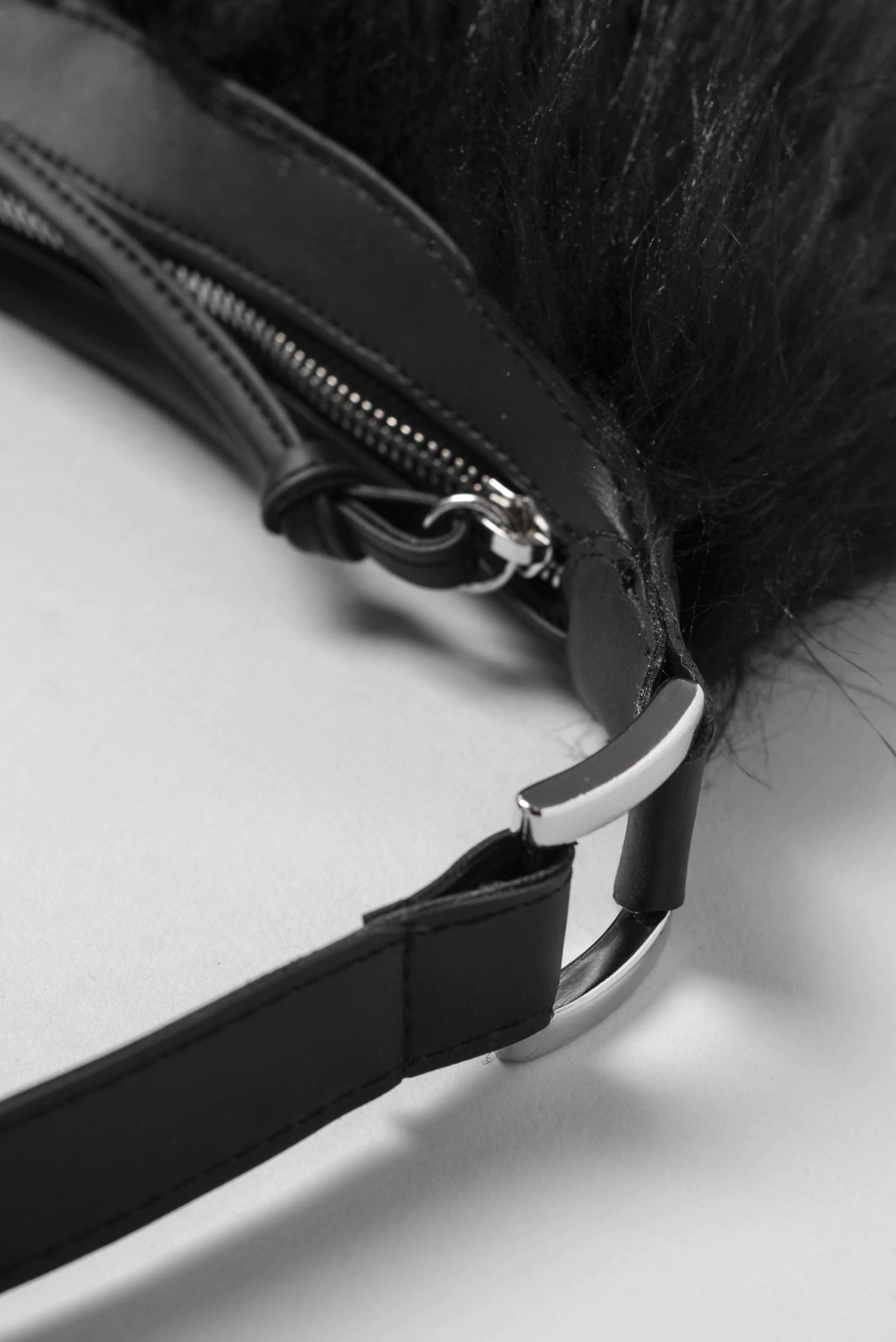 Cartera/bandolera estilo banana de corte irregular de piel sintética largo negro, correa regulable de PU, acceso por cierre, avíos níquel y bolsillo interno.