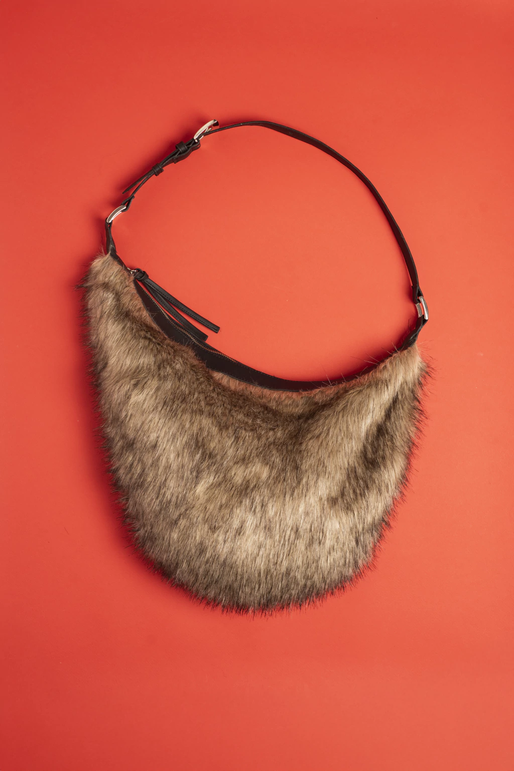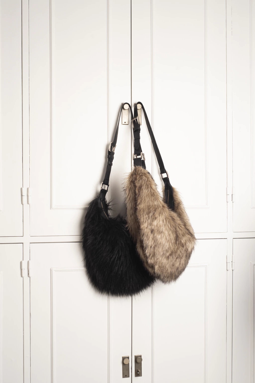 Cartera/bandolera estilo banana de corte irregular de piel sintética semi largo color beige con puntas negras, correa regulable de PU, acceso por cierre, avíos níquel y bolsillo interno.
