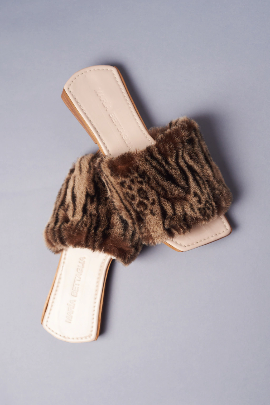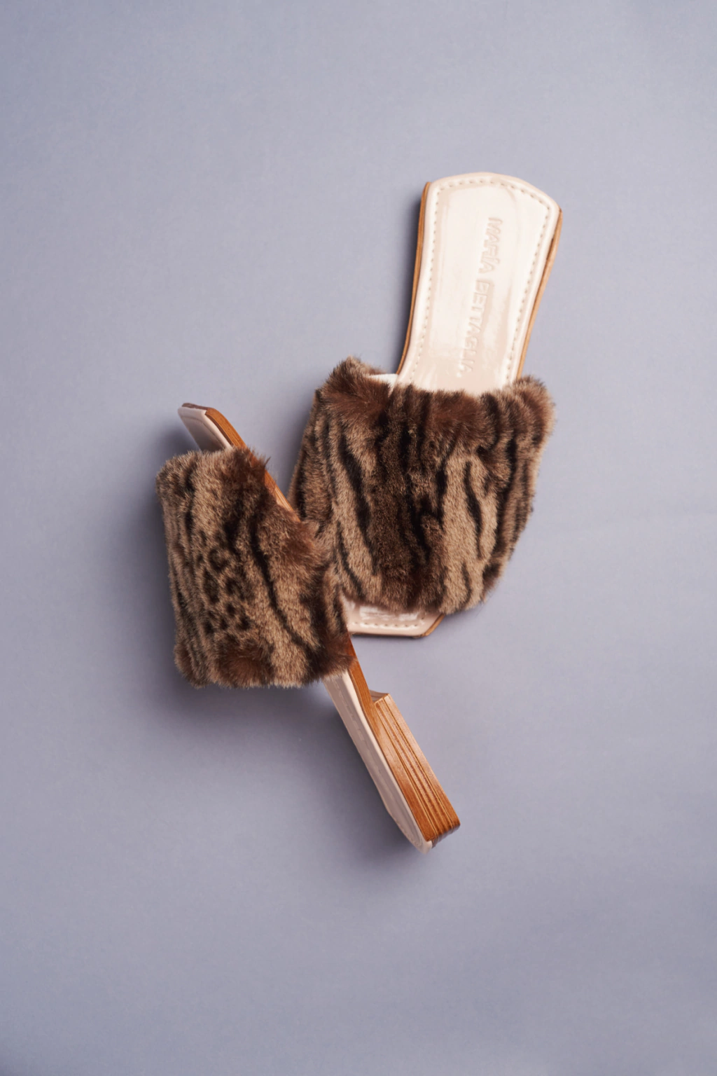 Chinuflas de piel sintética de pelo corto animal print color beige con franjas irregulares marrones. Forro de terciopelo.