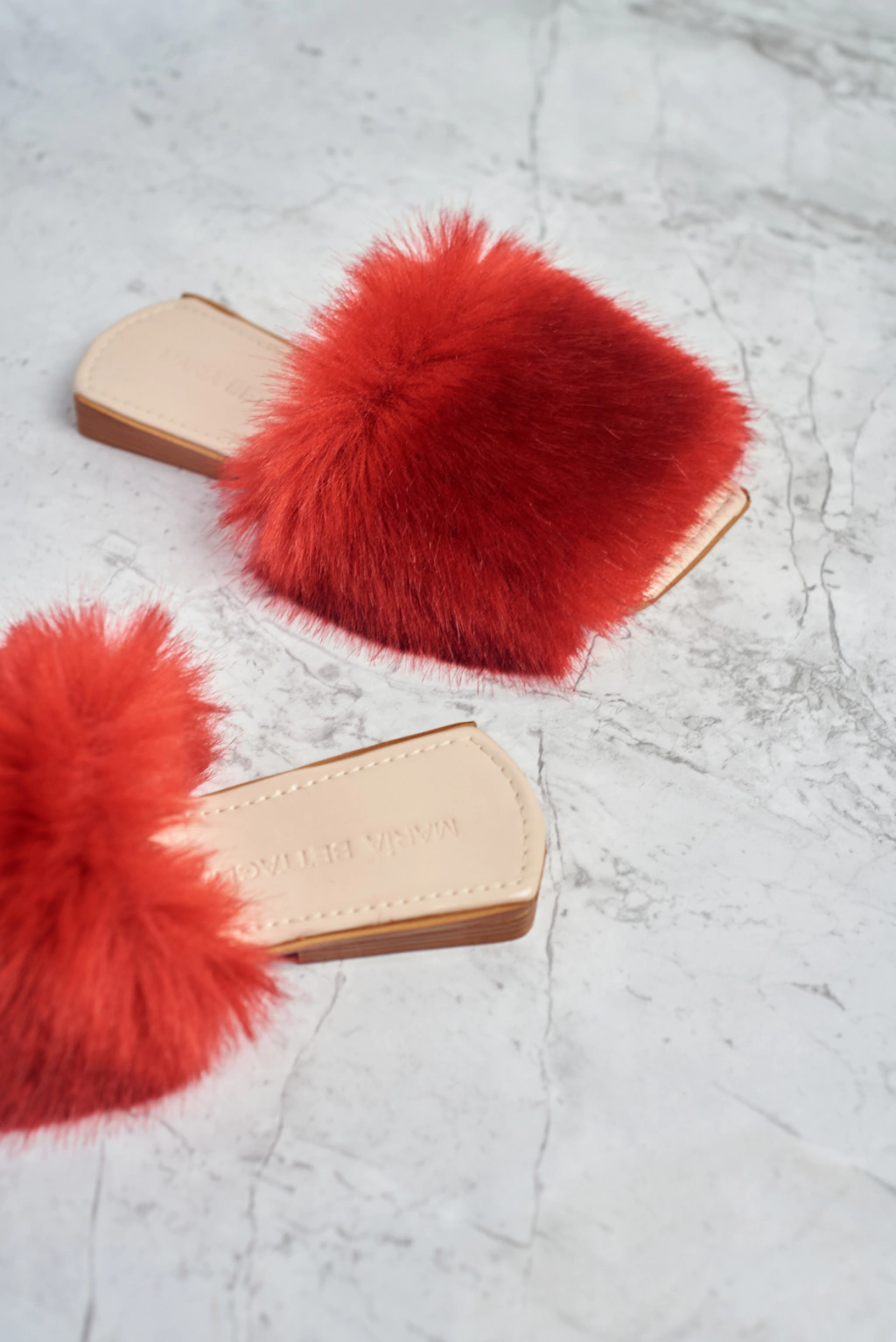 Chinuflas de piel sintética de pelo corto mullido color rojo. Forro de terciopelo.
