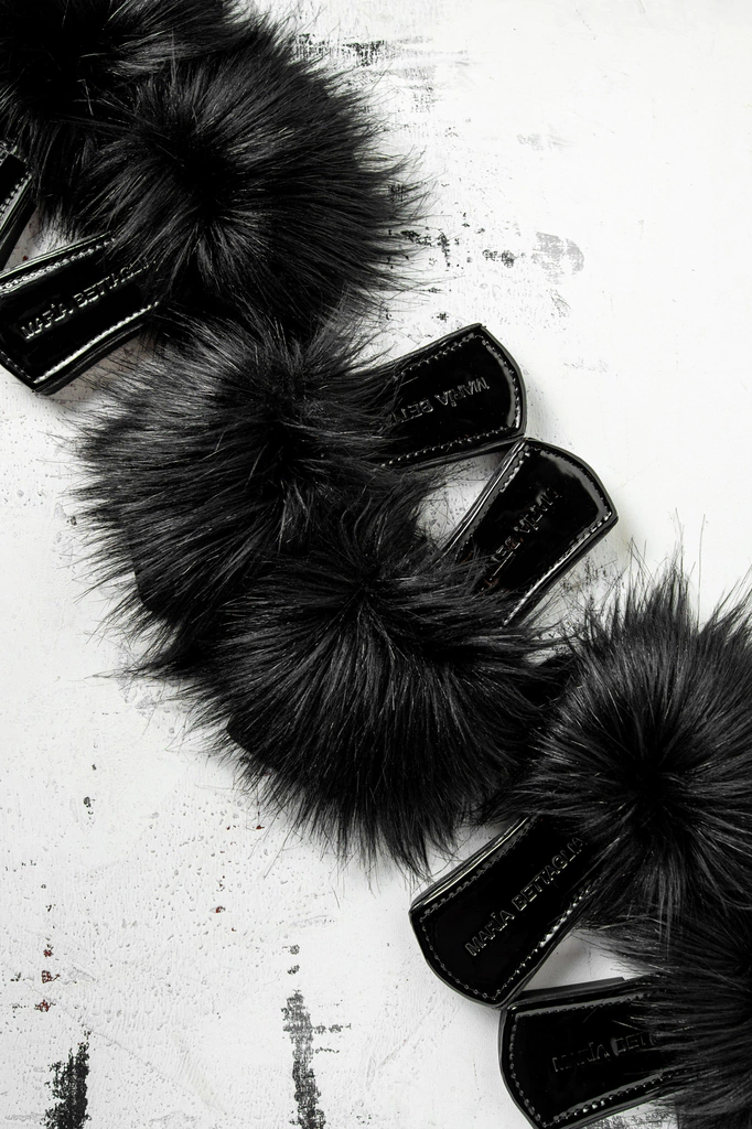 Chinuflas de piel sintética de una tira de pelo largo negro. Forro de terciopelo.