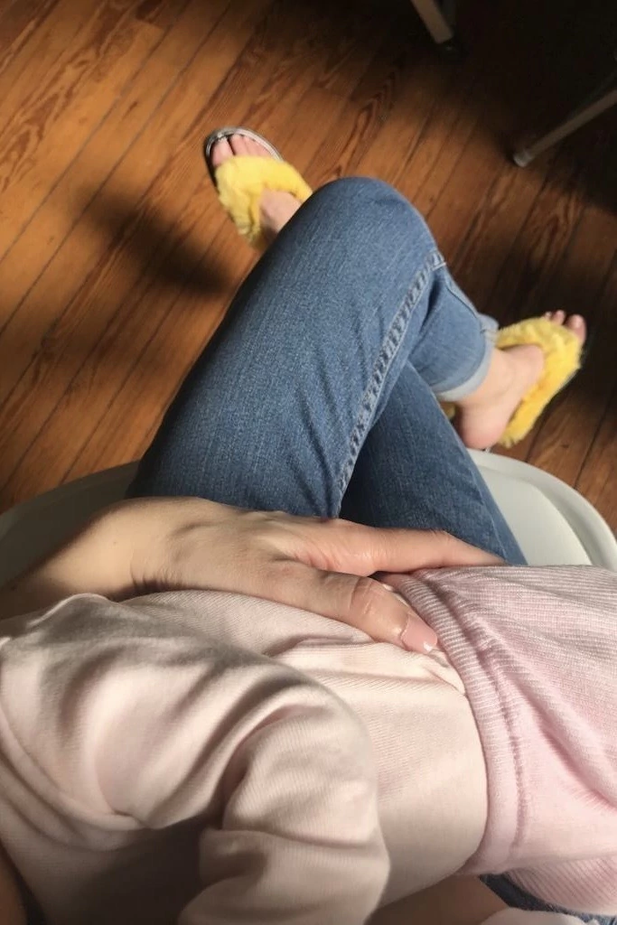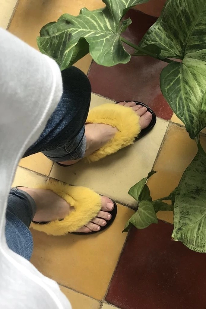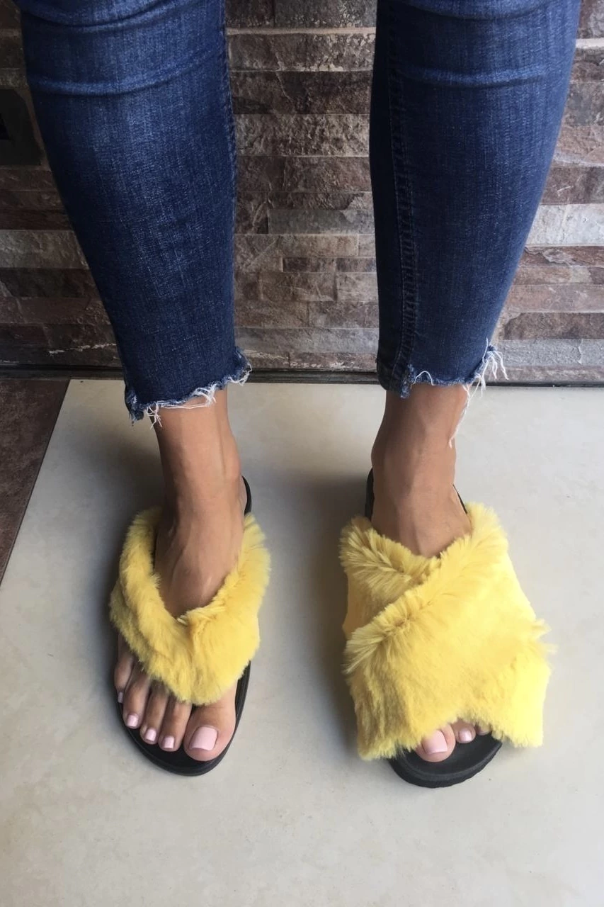 Ojotas de piel sintética de pelo corto de color amarillo, forro de terciopelo, plantilla de charol sintético.