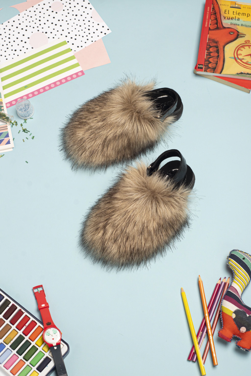 Tuflas tipo zueco cerrado de piel sintética de pelo semi-largo lacio color beige con puntas marrones; con tira de charol sintético negro con velcro ajustable.