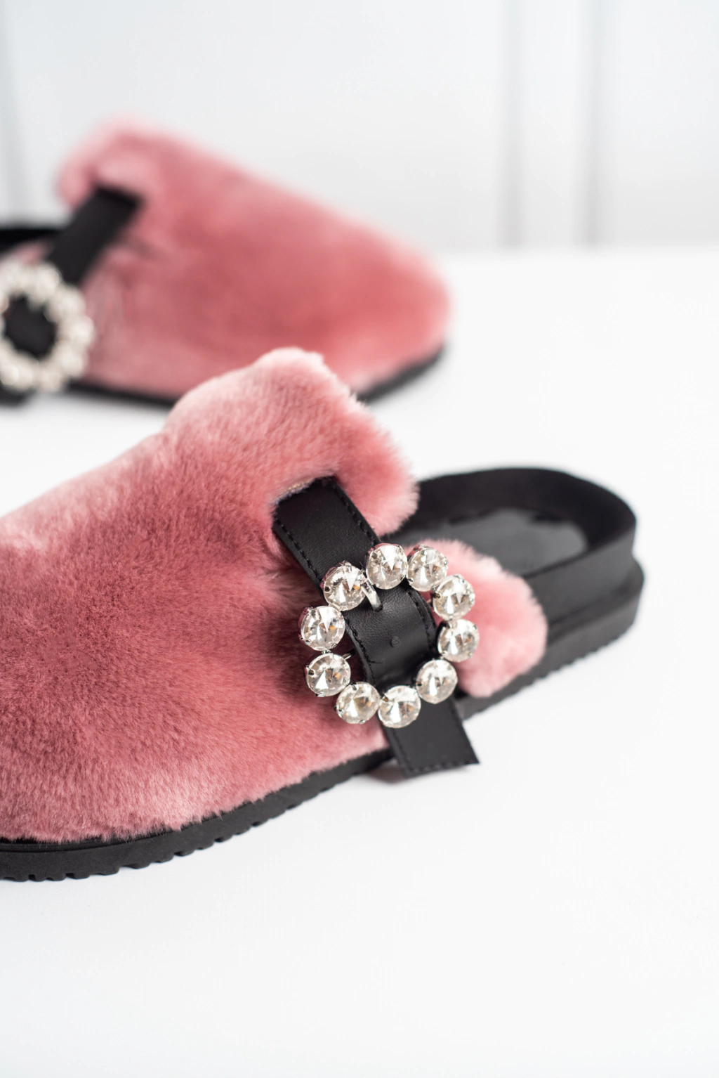 Tuflas tipo zueco cerrado de piel sintética de pelo corto rosa viejo. Cinturón de PU sintético negro opaco. Hebilla circular de 52 mm de diámetro con 10 piedras de strass. Plantilla ergonómica forrada en microfibra, encastrada en base de EPS. Altura total de la base: 3 cm.