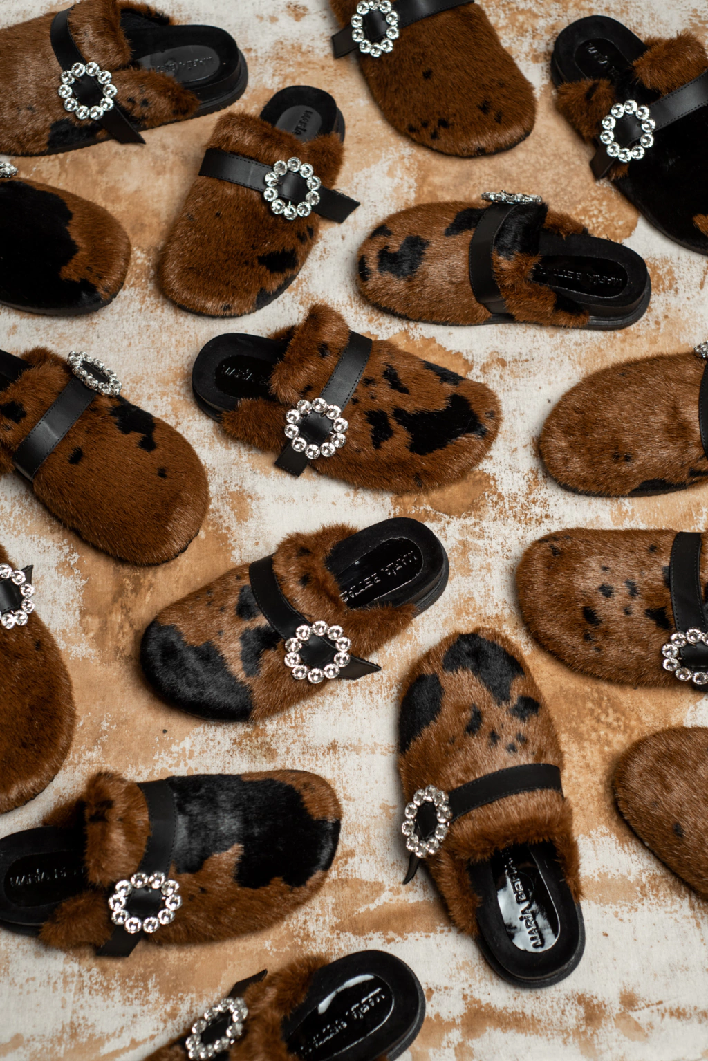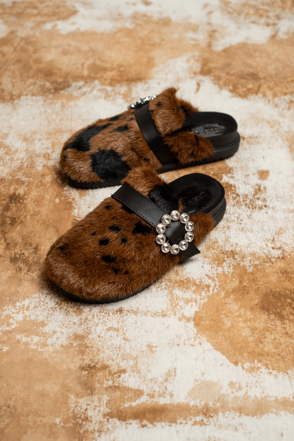 Tuflas tipo zueco cerrado de piel sintética símil vaca de pelo corto color habano con manchas negras irregulares. Cinturón de PU sintético negro opaco. Hebilla circular de 52 mm de diámetro con 10 piedras de strass. Plantilla ergonómica forrada en microfibra, encastrada en base de EPS. Altura total de la base: 3 cm. IMPORTANTE: La tela es súper irregular: Los pares suelen tener un pie con mancha grande o mediana y otro pie sin mancha, o los dos pies con manchitas medianas. Son todas distintas, ¡pero igual de lindas!