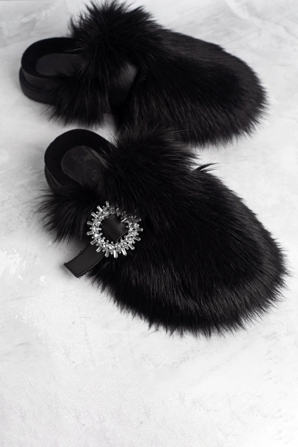 Tuflas tipo zueco cerrado de piel sintética de pelo semi largo ultra fino y lacio color negro opaco. Cinturón de PU sintético negro opaco. Hebilla de strass circular con picos. Plantilla ergonómica forrada en microfibra, encastrada en base de EPS. Altura total de la base: 3 cm.