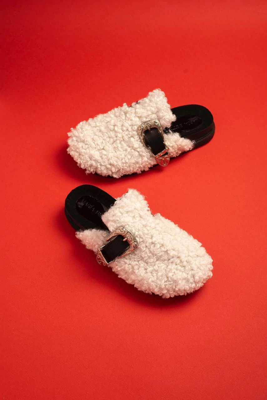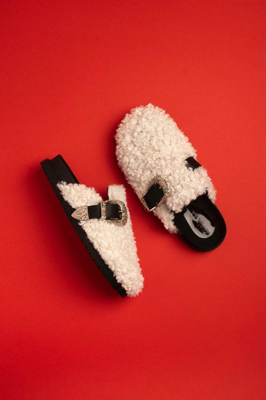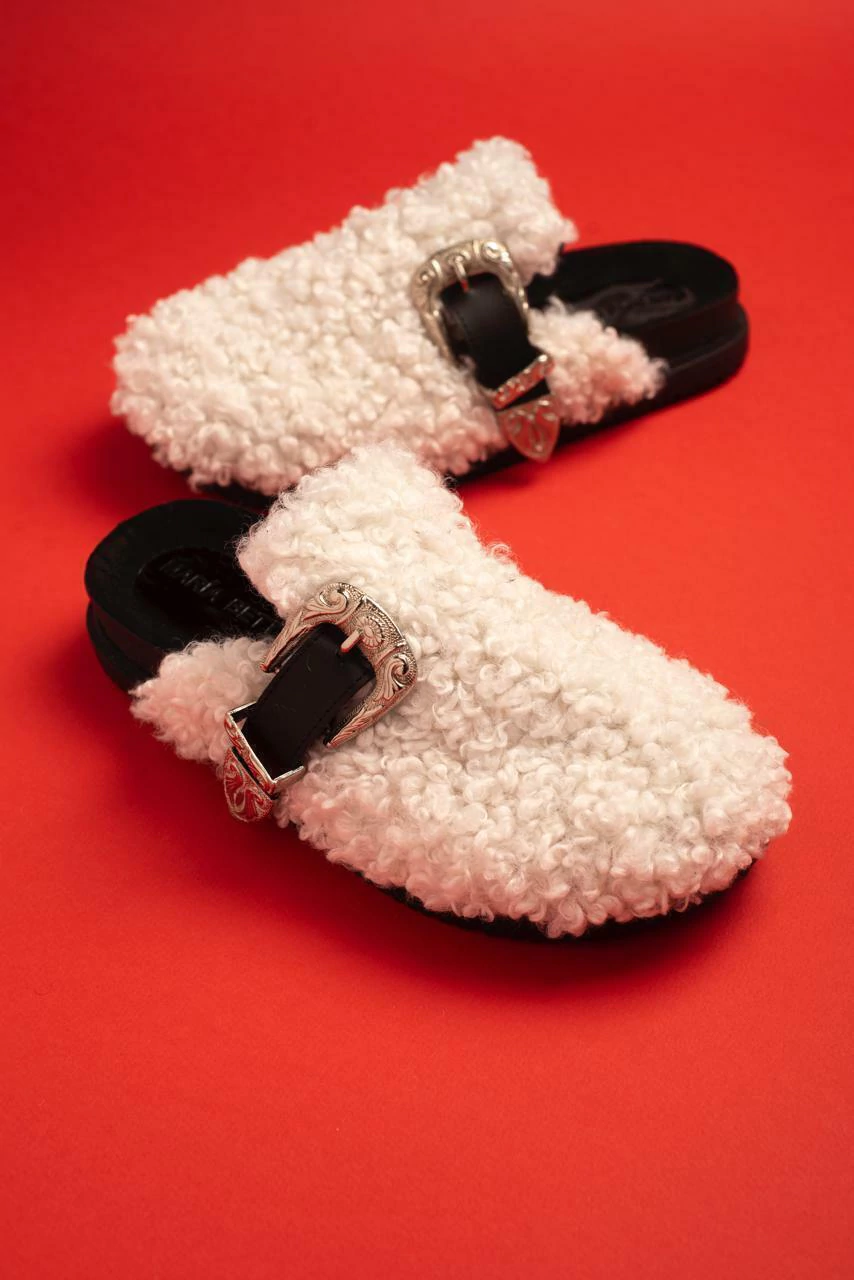 Tuflas tipo zueco cerrado de piel sintética de pelo corto enrulado sin volumen color blanco. Cinturón de PU sintético negro opaco con hebilla níquel estilo texana de pase 25, con pasador y terminal haciendo juego. Plantilla ergonómica forrada en microfibra, encastrada en base de EPS. Altura total de la base: 3 cm.