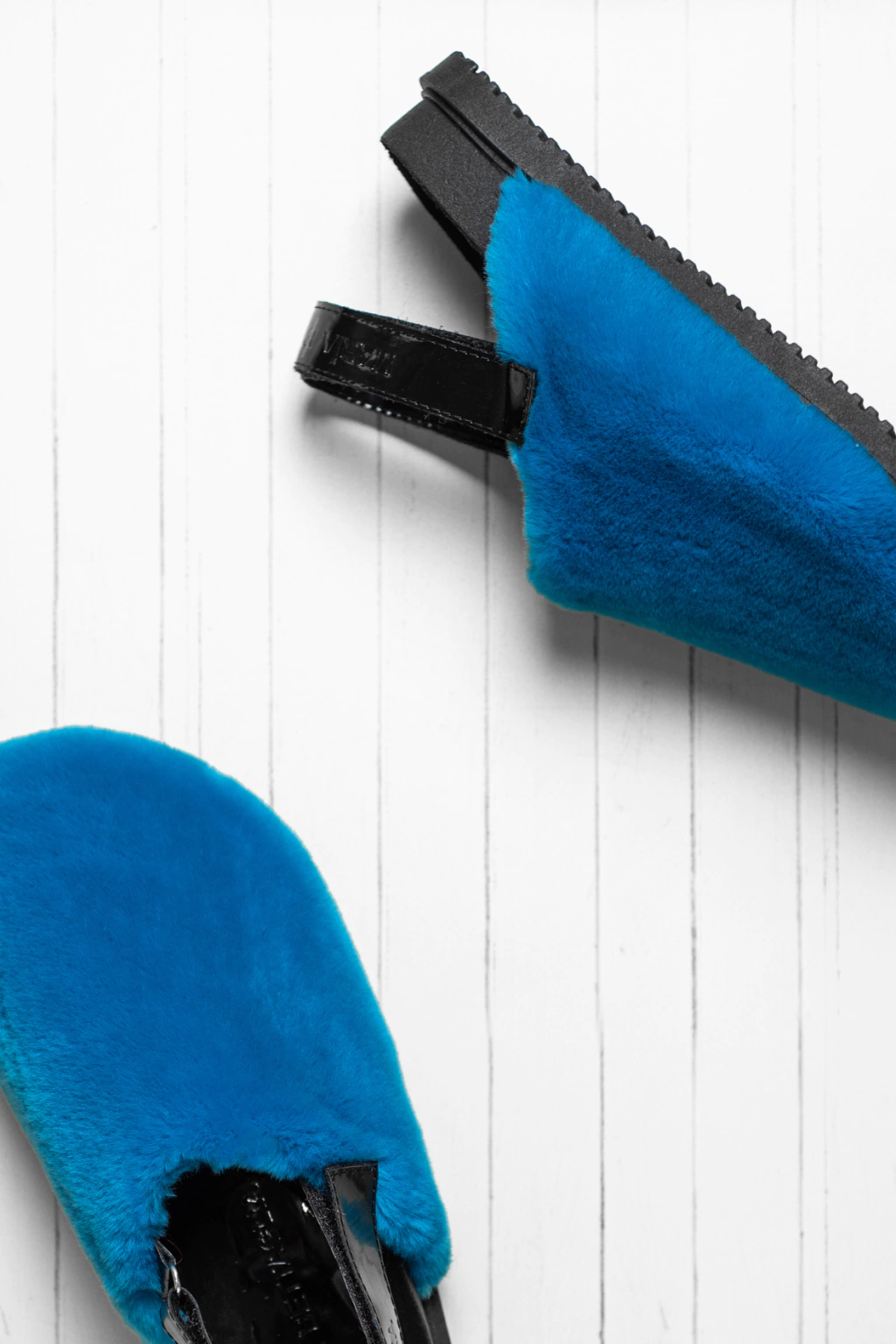 Tuflas tipo zueco cerrado de piel sintética de pelo cortito turquesa; con tira de charol sintético negro con velcro ajustable. Plantilla ergonómica forrada en microfibra, encastrada en base de EPS. Altura total de la base: 3 cm.