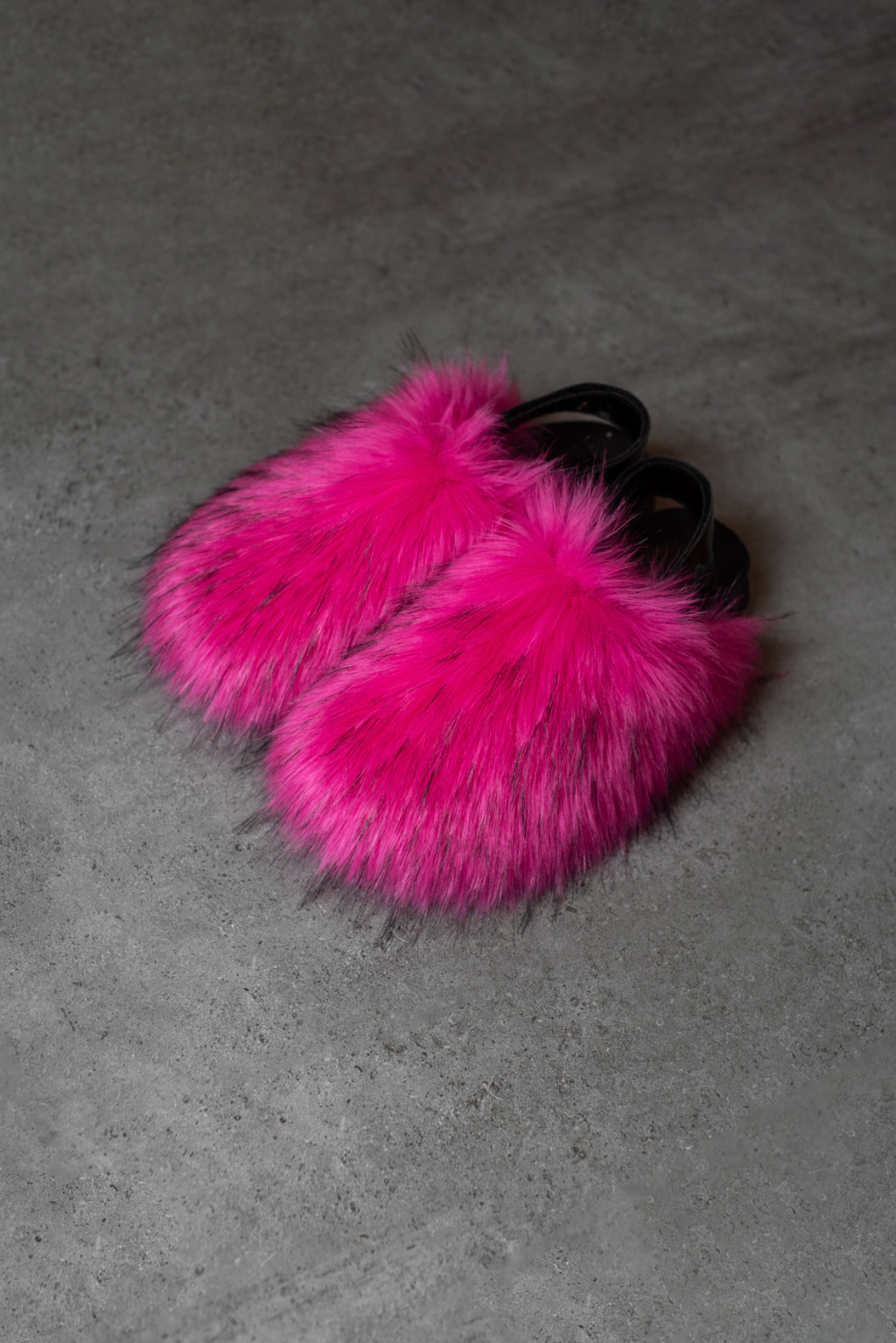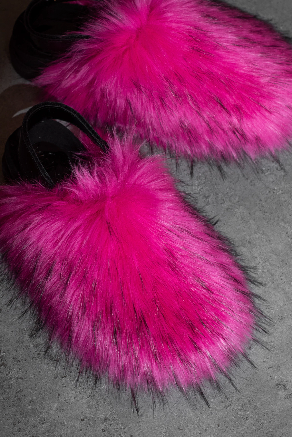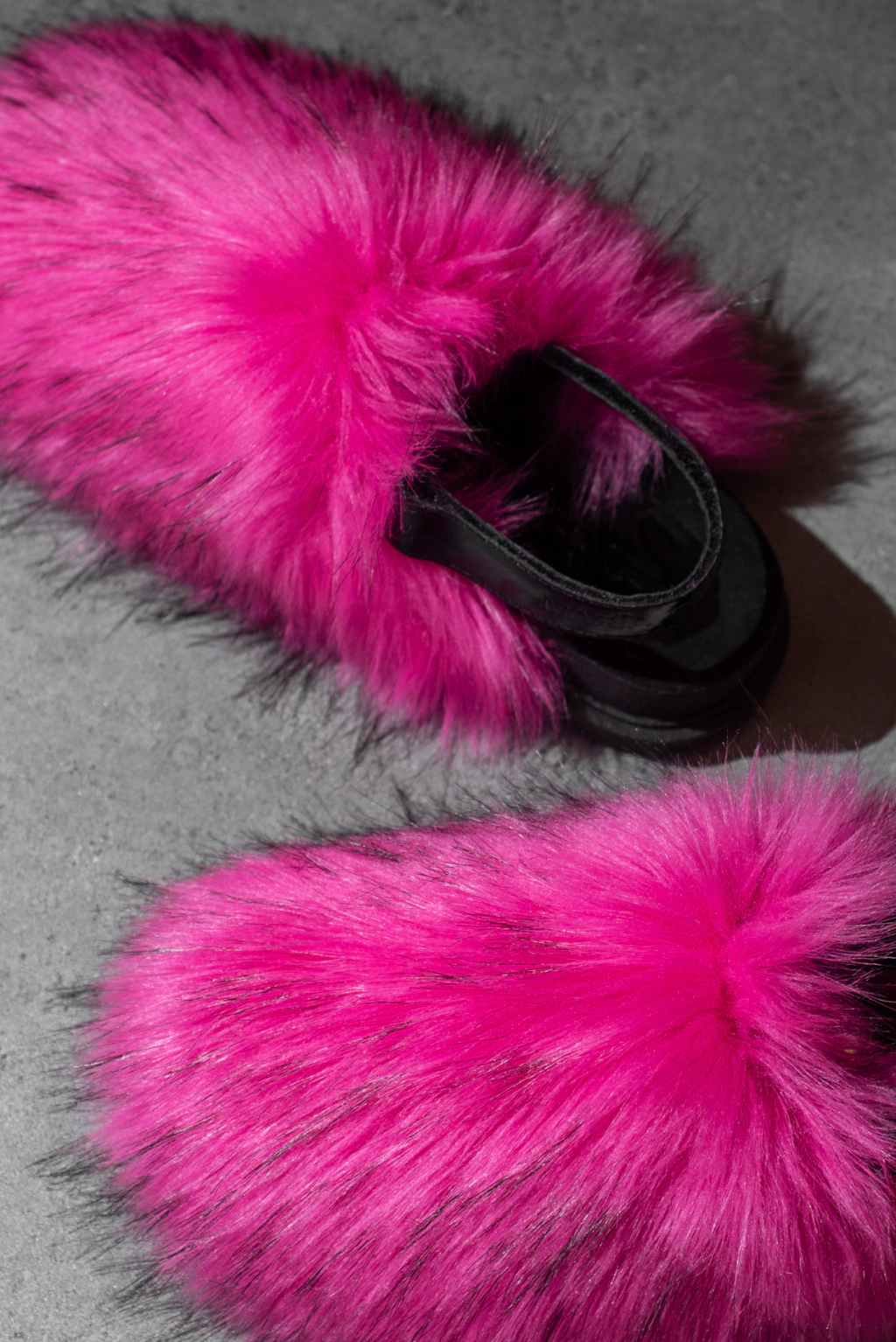 Tuflas tipo zueco cerrado de piel sintética de pelo intermedio color fucsia con puntas negras; con tira de charol sintético negro con velcro ajustable. Plantilla ergonómica forrada en microfibra, encastrada en base de EPS. Altura total de la base: 3 cm.