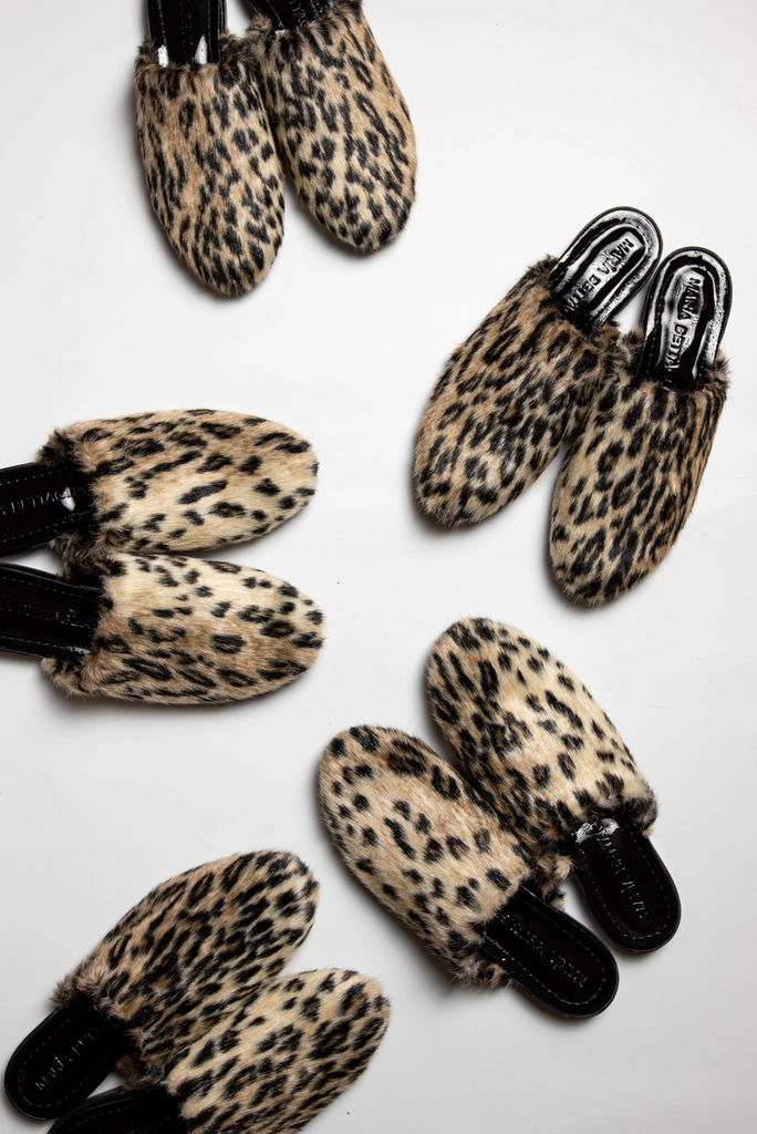 Zuetuflas de piel sintética animal print de pelo ultra corto. (IMPORTANTE: La tela es muy irregular, por lo que ambos pies pueden ser distintos entre sí. Por la irregularidad de las manchitas, puede haber pares más claritos, de manchado intermedio y más oscuros). Base de EPS con taquito de 2 cm. Plantilla de charol sintético y forro de terciopelo de la más alta calidad.