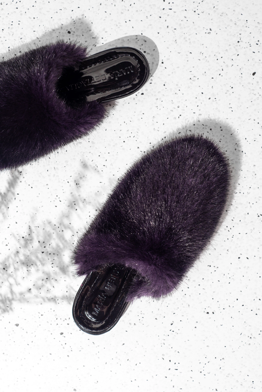 Zuetuflas de piel sintética de pelo corto color púrpura con puntas negras. Base de EPS con taquito de 2 cm. Plantilla de charol sintético y forro de terciopelo de la más alta calidad.